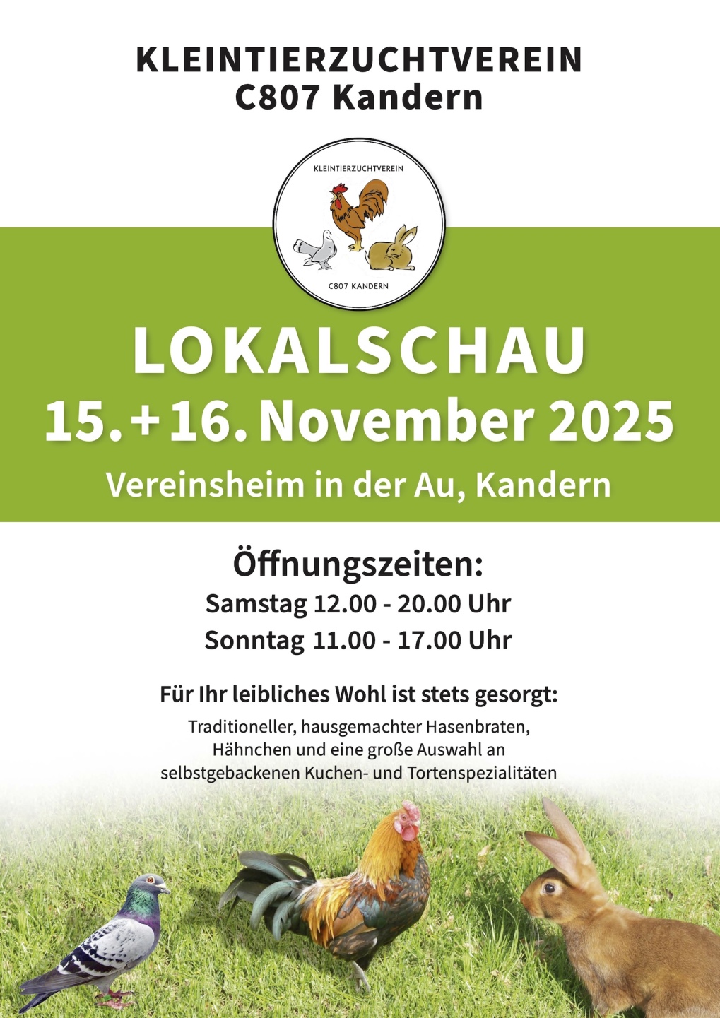 Willkommen beim Kleintierzuchtverein C807 Kandern! Bitte beachten sie die aktuell gültigen Regelungen für den Kleintiermarkt! nächster Kleintiermarkt findet am 8. November 2025 statt Jeden 1. Samstag im Monatg findet unser Kleintiermarkt statt (außer Januar und Februar) Wir laden herzlich zu unserer Lokalschau am 15. und 16. November 2025 ein. ![]() | ![]() |